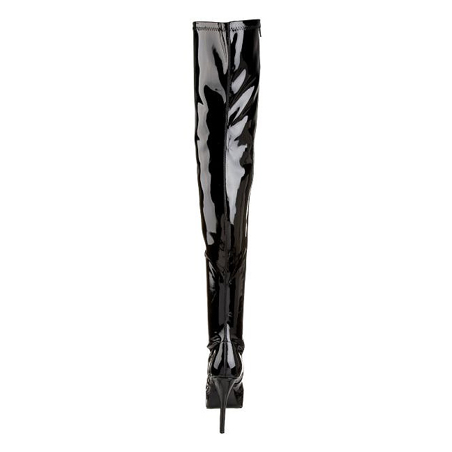 Devious - IND3000/B - 5 1/4 "" (13,3 cm) høy hæl, 1 1/4" (3,2 cm) svart plattformhæl, fetisjlakkstøvler over kneet med elastisk stretchskaft, lukket hæl bak, fremre peker Tåområdet. Overknee damestøvler med plattform, fotsengen er polstret med en innersåle for høy bærekomfort. Plattform overknee høye hæler, svart overdel laget av skinnende lakk. Glidelås er plassert på siden over hele skafthøyden. Pleaser Devious støvler er laget med kjærlighet!