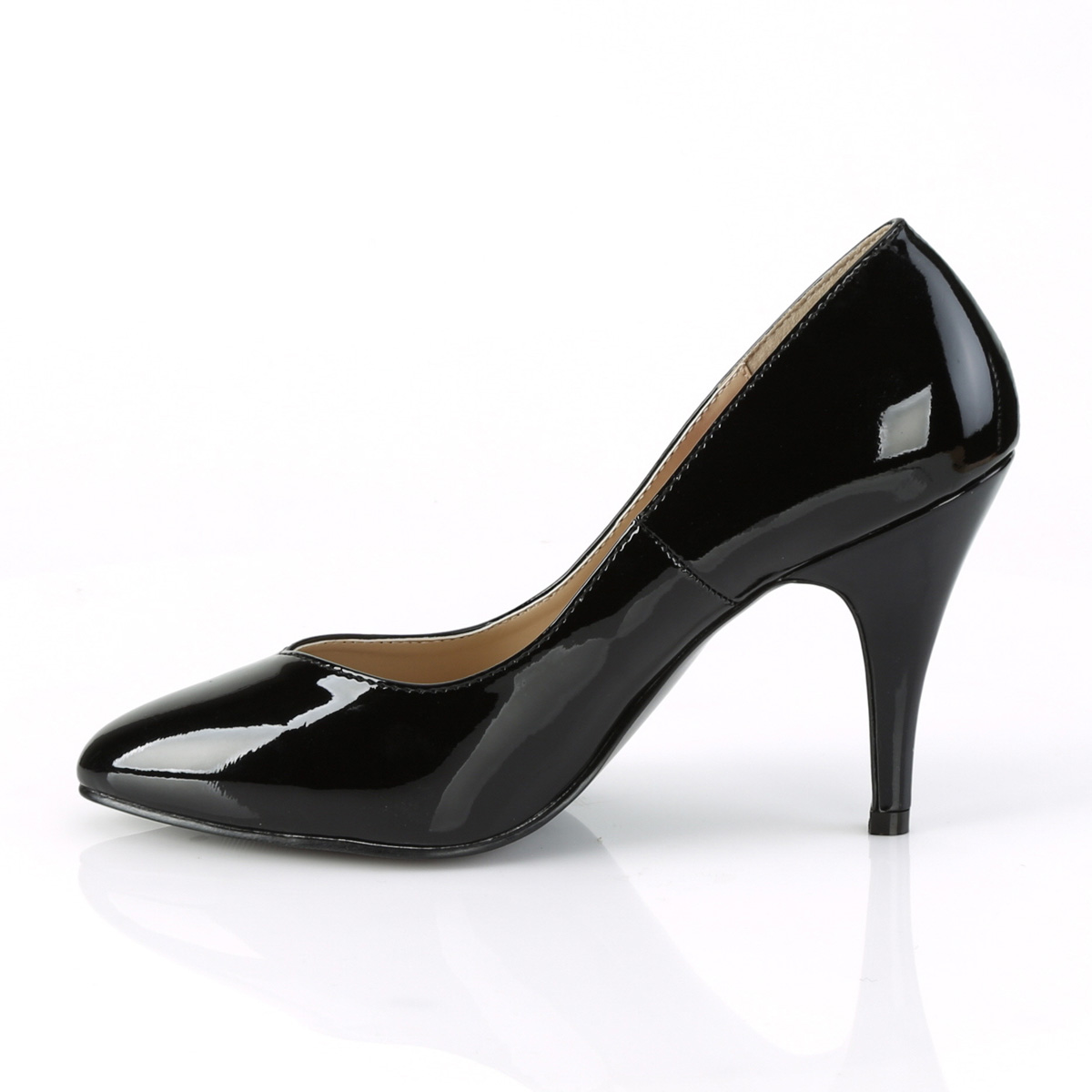 Pleaser Pink Label - DRE420W/B - 4 "" (10,2 cm) Mini høyhæl, brede lakklærpumper med cleavage hals, cleavageé Pumps er modellert foran tåområdet med V-hals, lukket tåområde foran, lukket hæl bak for brede føtter. Patentpumper med lave hæler for størrelsene 39, 40, 41, 42, 43, 44, 45, 46. Fotsengen er polstret med en innersåle for høy komfort. Bred pumps sort overdel laget av skinnende lakk. Pleaser Pink Label-sko er laget med kjærlighet! Passer også for menn, kvinner, drag queens, crossdressere, transmenn eller transkvinner.
